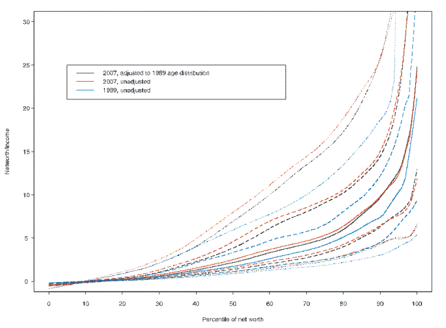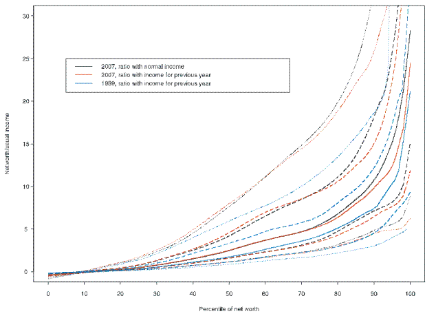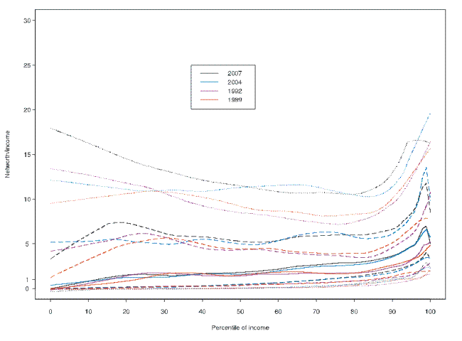 income across the wealth distribution, all of the conditional quantiles are upward sloping--and increasingly so at the top of the wealth distribution. Moreover, from the early surveys--1989 and 1992--to the more recent ones--2004 and 2007--the ratio appears to have increased across most of the