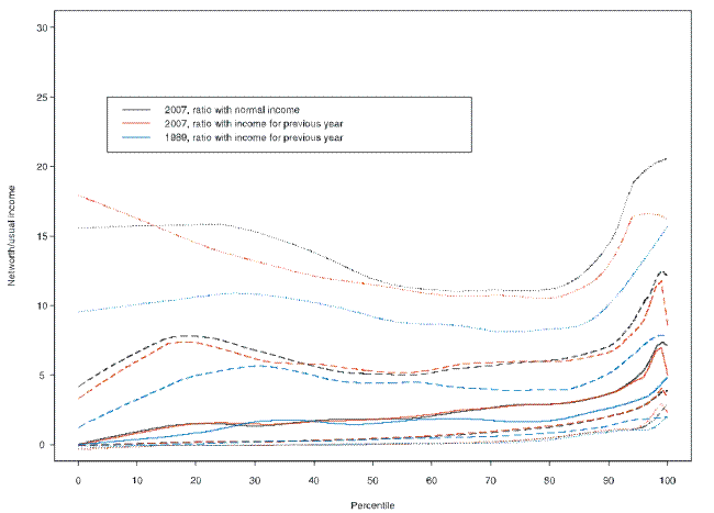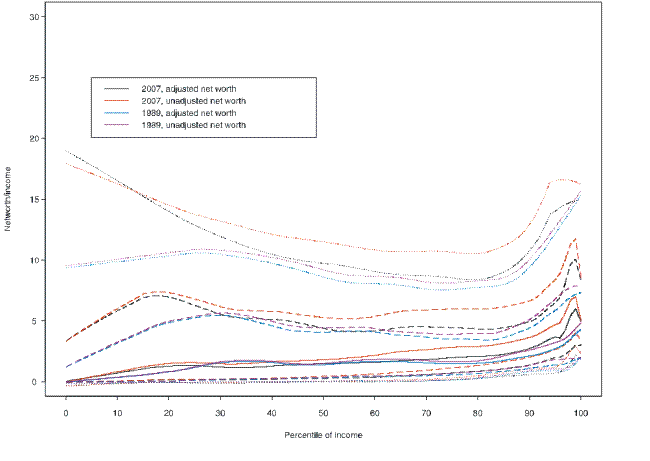 Some part of the general rise in the conditional ratio over the 1989-2007 period may be explained by the defects in the definitions of net worth and income. Of particular note over this time is the rise of account-type pension plans--which are included in the measure of wealth used here--and the decline of defined-benefit plans--which are not included in the wealth measure. Unfortunately, it is very difficult to address the importance of these shifts. As noted earlier, valuation of defined-benefit plans at the individual level is fraught with difficulties. Assuming that account-type pension plans are an exact substitute for the previously more common defined-benefit plans, one could simply ignore all types of pensions--the defined-benefit type as well as the account-types that are included in the wealth measure used so far. The risk in this approach is that the account-type plans may represent both "replaced" defined-benefit wealth and wealth that would have been accumulated in some other non-tax-preferred form in earlier years; thus, it seems likely to understate wealth by a greater proportion in later years. Figures 16 and 17 show the effect of the extreme adjustment of excluding all tax-deferred retirement accounts from the value of net worth used in the conditional distribution of the ratio across the distributions of net worth and income, respectively. As expected, the elimination of the retirement assets depresses the ratio across both the wealth and income distributions, with differentially larger effects in 2007 than in 1989. Though weakened, the general conclusions based on the unadjusted data still hold even in this case.