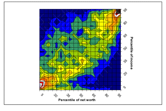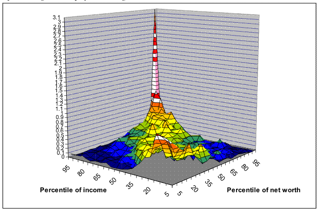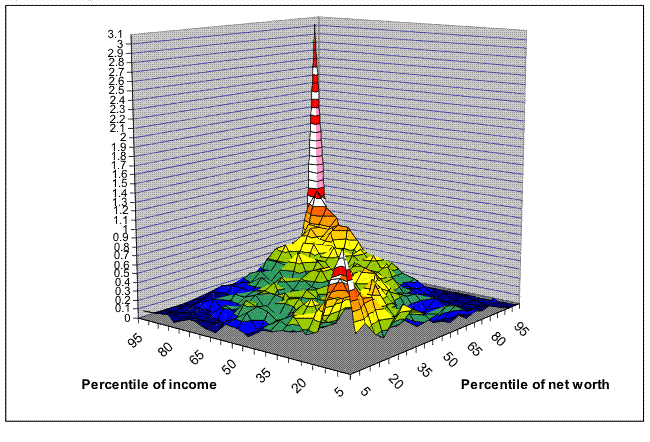 Looking directly at the joint distribution of wealth and income is complicated by the very great range in wealth (income) values in each range of income (wealth). One way of dealing with the range of values while making an estimated distribution visually digestible is to use a copula, a type of distribution with uniform margins. To make such a plot here, net worth and income values for each case were transformed to the equivalent percentile points of their own distributions and divided into ordered groups of 5 percent. Cases were then cross-classified by their positions in the two sets of 5-percent groups and a surface was computed over the underlying percent of all families estimated to be in each 5-by-5 group. Note that by definition, the sum of all the underlying values is 100, the sum across the income (net worth) axis for any 5-percentile group of net worth (income) is exactly 5 percent, and the maximum value for any square is 5 percent. If net worth and income were independent, each underling square would have the average mass, one-quarter percent.