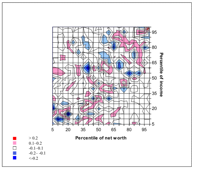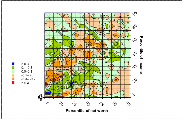 It is often argued that life-cycle effects complicate the interpretation of wealth and income distribution: Young people should have low wealth relative to their incomes, retirement-age people should have high wealth relative to their incomes, and older people should have progressively lower levels of wealth relative to their incomes. One way to examine the implications of these differences is to standardize income and wealth as of a given age. Here a regression of wealth and income on a fourth-order polynomial in age is used to adjust the observed values of wealth and income to their hypothetical values as of age 45.27 Figure 22 shows a plot of the copula distribution of wealth and income that results from this adjustment, along with a two-dimensional projection (figure 23) of the level of the unadjusted data minus the adjusted data. There do appear to be some meaningful changes under this scenario: The crest along the diagonal between the poles of the distribution becomes overall somewhat sharper--that is, wealth and income become more correlated. There is also some shifting of the share of families relatively low in the income distribution to have higher levels of wealth. Nonetheless, the general shape of the distribution is unchanged. The result suggests that age differences, in the crude sense modeled here, may be less important in explaining the relationship between wealth and income than is typically suggested.