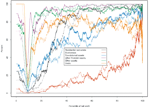 Over the years of SCF data, the low point for ownership of any asset or debt across the net worth distribution occurs at about the 10th percentile (9.7th percentile in 2007), where the wealth distribution touches zero and is negative at lower percentiles; patterns of ownership on either side of that point are approximately symmetrical, except in the case of debt, which is by logical necessity held by all families with negative wealth. Figure 24 shows the patterns of ownership in 1989 and 2007 for a set of categories. Ownership of residential real estate (a principal residence or other residential real estate) in 2007 (solid line) rose sharply to about the 40th percentile, where the ownership rate was over 80 percent, and continued to rise more slowly to well over 90 percent at the top of the wealth distribution; increases in ownership from 1989 (dotted line) are clear in the region below the median of the wealth distribution. Business ownership (including all types of private businesses) has a nearly opposite profile: in 2007 it rose slowly from the zero point and it rose much more steeply at the top of the wealth distribution; from 1989 to 2007, ownership generally declined by varying amounts. Ownership of tax-deferred assets (account-type retirement accounts from which the owner could either make withdrawals or against which the owner could take out a loan, plus individual retirement accounts [IRAs], Keogh accounts, annuities with an equity interest and cash-value life insurance) rose approximately linearly across the wealth distribution in 2007; from 1989, ownership rose substantially across nearly the whole wealth distribution. Ownership of other financial assets (a broad category including checking, savings and money market accounts, stock, bonds, managed investment account, trusts with an equity interest, and all other financial assets besides tax-deferred ones) was well over 90 percent of families in the part of the wealth distribution above the 20th percentile in 2007; from 1989, the most notable change was an increase in ownership for the group from the 10th to the 25th percentile of the wealth distribution. Other assets (a category consisting mainly of vehicles including automobiles, trucks, motorcycles, airplanes, boats, etc., along with miscellaneous assets such as antiques, artwork, precious metals, etc.) were owned by over 90 percent of families across most of the wealth distribution; the data show some growth in ownership below about the 25th percentile of the wealth distribution and small decreases above that point. Debt (including all borrowing except debt on business assets, which are treated here as net values) was held by about three-fourths or more of families above the 20th percentile of the wealth distribution; the likelihood that a family had debt rose across most of the distribution from 1989.