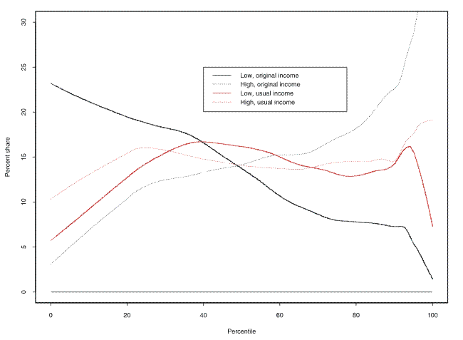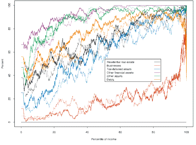 One final complication is worth noting: all wealth and income values considered are pre-tax. Accounting for income taxes would usually reduce, approximately progressively, the total amount of income, except in cases where a taxpayer is entitled to a refundable tax credit. Some debt payments are deductable against income; the consequence could be viewed either as additional income for a given family or co-ownership of the debt. Assets that have a tax-deferred feature, such as special retirement and health saving accounts, and assets whose values embody unrealized capital gains could also be thought of as being co-owned with government. It would be reasonably straightforward to adjust the reported income using a program such as TAXSIM, though it is unlikely that there would be sufficient data to allow for estimates of the complex adjustments that sophisticated taxpayers sometimes make.15 The case for wealth is much more complex, because any adjustment would turn on the future tax structure as well as a set of systematic assumptions to discount the effects to a present value.