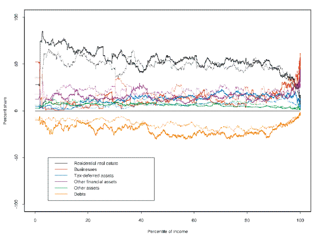 While the distributions of wealth and income overall varied in complex ways over the 1989-2007 period considered in this paper, the underlying patterns of composition across groups in those distributions were relatively stable over that time. For wealth, vehicles tend to be the most common asset of the poor, owned residences tend to be more important for families in the broad middle range of wealth, and businesses and financial assets generally constitute the largest part of the assets of the wealthiest families. Holding of debt is widely spread across the wealth distribution, but the degree of leverage tends to decline with wealth. Over the 18-year period, debt increased as a share of assets across the wealth distribution; the share of principal residences rose mainly below the median of net worth; the share of tax-deferred retirement accounts rose; and the share of other financial assets declined. For income, pensions and other retirement income and transfer payments tend to be the largest part of the income of the lowest part of the income distribution, wages and salaries are the largest component of income in the broad middle range of income, and business and other capital income have large shares along with wages at the top of the distribution. Over the 18-year period, the clearest change was a general decline in the relative importance of capital income other than that from businesses.