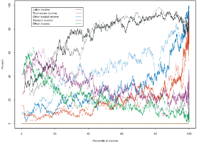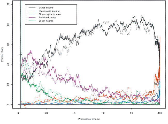 At the bottom of the income distribution, the dominant sources in 2007 were labor income (wages and salaries), pension income (payments from Social Security or a defined-benefit pension, or withdrawals from any type of tax-deferred retirement account) and other income (welfare payments, alimony, child support, workman's compensation or unemployment payments, and miscellaneous income (figure 28) ; business income (income from farming, self-employment, or private businesses) and other capital income (interest, dividends and capital gains) were received by very few families. The fraction of families receiving labor income rose across the distribution and dipped somewhat at the top of the distribution. Receipt of business and other capital income trended up moderately across the distribution until approximately the 95 percentile of the income distribution, at which point the fraction increased sharply. The share of families receiving pension income or other income tended to decline across the distribution. The clearest change in receipt from 1989 was the substantial decline across most of the income distribution in the percentage of families that received other capital income.