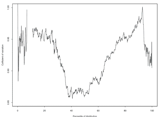 The pair-wise comparisons of distributions across the surveys, shown in figure 2, reveal considerable variability in the shifts across years as well as across the wealth distribution, beyond what might be expected from sampling error. Indeed, a plot of the coefficient of variation (standard deviation divided by the mean) of the growth rate of the quantile values across the survey years (black line, figure 3) shows a minimum in the vicinity of the 45th to the 55th percentile of the wealth distribution with sharply rising values on either side of that interval; variability by this measure turns down again around the 90th percentile.21