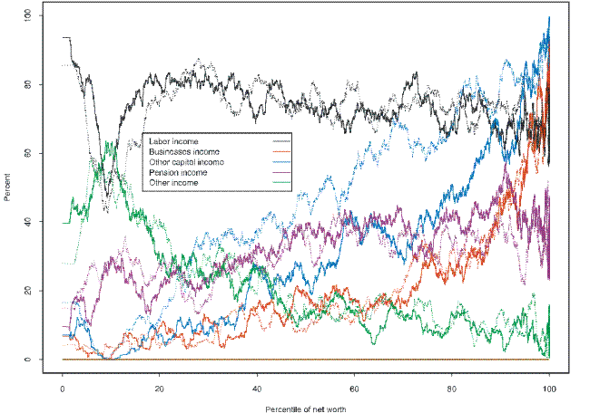 When viewed by the distribution of net worth, receipt of income in 2007 had a kink in the region of zero net worth with approximately symmetrical patterns on either side (figure 30) , as was the case for the ownership of various portfolio items. With one exception, the pattern of receipt across the wealth distribution mirrored that across the income distribution. The exception was receipt of pension income, which trended upward across the wealth distribution; this fact reflects the relatively greater proportion of older families in the higher ranks of the wealth distribution. Again, the most notable change was a decline in the receipt of other capital income for most families. Income shares above the kink point and below the top decile of wealth were generally flatter than the corresponding shares across in the income distribution (figure 31) . The share of labor income sloped downward in this region of the wealth distribution, in contrast to the upward slope across the income distribution.