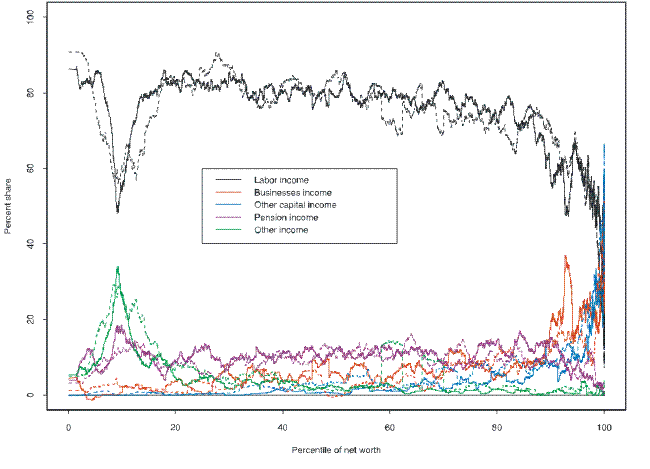 Income, as constructed for this paper, consists of returns to assets as well as transfers and returns to labor. Obviously, the first of these is dependent on asset choices. The other two may be indirectly affected by asset choices. Like wealth composition, the composition of income differs substantially across the distributions of income and net worth, but the relative patterns appear relatively stable over time.