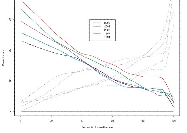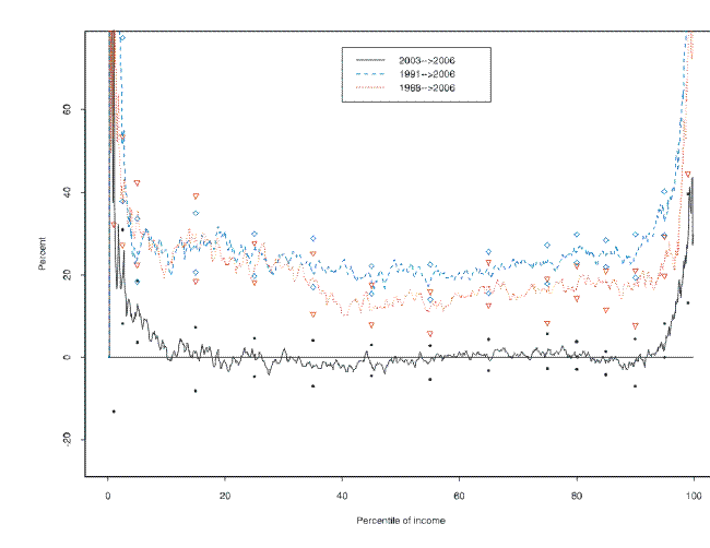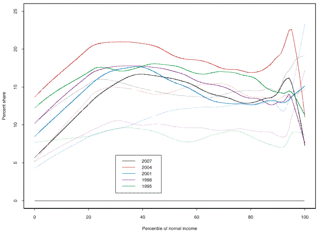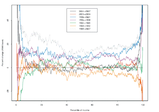 The relative quantile-difference plot for income over the 1989-2007 surveys shows a similar shape to that for net worth (figure 4) .22 But there are a few notable differences. Although there is a relatively flat region of growth between about the 20th and 90th percentiles, the rate of growth is much smaller--under 20 percent. The spike at the top of the distribution is a little sharper than in the case of income. Year by year (figure 5) , the data show that the turn-down observed in the 1992 survey was shared broadly equally in percentage terms, between about the 40th and 90th percentiles of the income distribution; lower in the distribution, changes were mixed; higher in the distribution, the losses tended to be progressively larger. Both the 1998 and 2001 surveys showed broad gains, with very large gains at the top. Over the most recent period, 2004-07, the data show virtually no change for the great majority of the distribution, but particularly large proportional gains at the bottom and the top.