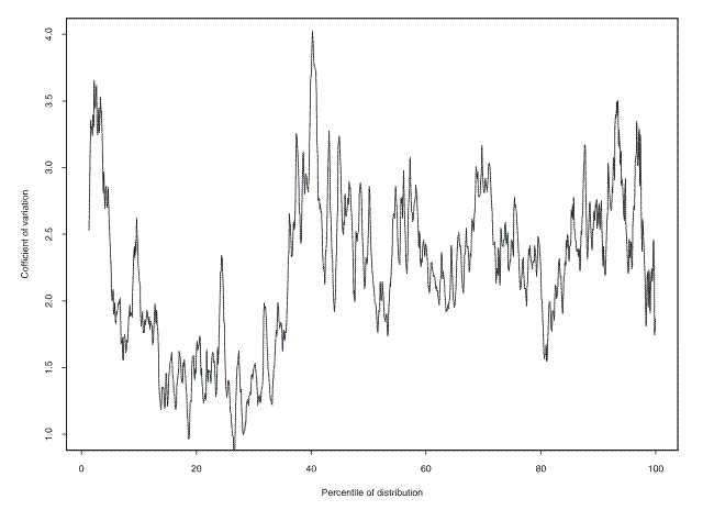 The variability of the growth rate of income is much greater across the distribution than is the case for net worth (figure 6) --the coefficient of variation is almost entirely between 1 and 4, as opposed to between about 0.85 and 1 for net worth. Particularly for people with more than minimal wealth, it seems not unreasonable that the value of the stock of wealth would be less variable than their income. The plot of variability is also much spikier than is the case of net worth, perhaps as an artifact of the heaping of income values at round numbers in nominal form.