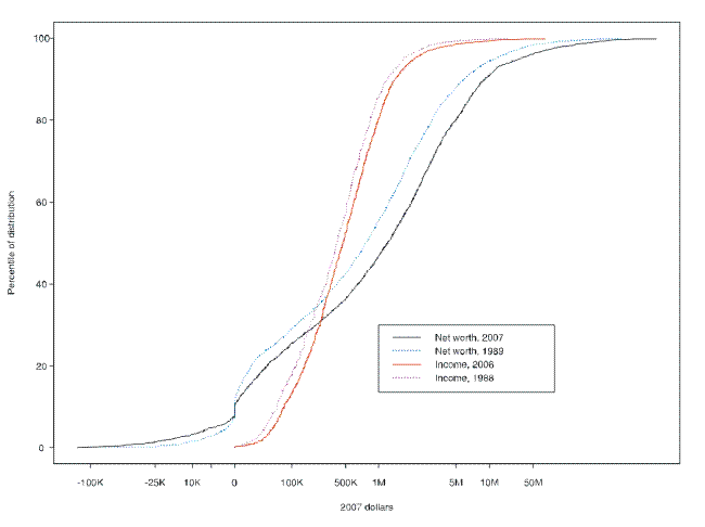 The behavioral dimensions of wealth accumulation and income generation are of great interest, but they are not the focus of the work presented here. Although the paper is largely descriptive, a variety of points emerge in the paper that bear on the set of plausible underlying behavioral structures. Descriptive discussions of wealth and income sometimes focus on narrow and controversial distributional aspects of these variables, such as inequality of distribution. "Inequality" may seem a simple term, but operationally it may mean many different things, depending on the point of view. The approach taken in this paper is to attempt to look at wealth and income neutrally and as broadly as possible, within the limits of this format, to characterize a range of what appear to be the most important distributional properties of wealth and income and their changes over the 18 years from 1989 to 2007.