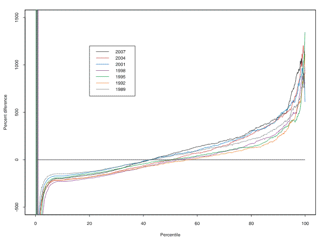 As is clear from the discussion above, net worth and income are very differently scaled. But the distributions are quite differently shaped as well. Whereas the net worth distribution has a substantial mass closely clustered around zero net worth, the income distribution is more smoothly increasing, as shown in figure 8.24 This general pattern has been relatively stable since at least the 1989 survey, though the degree of clustering at zero net worth has diminished. To gain a sense of the difference in shape of the two distribution, figure 9 shows a relative quantile-difference plot of net worth and income ((net worth - income)/income). Across the surveys from 1989 to 2007, the distributions reach the same value between the 40th and 60th percentiles of the distributions. Although there appears to be no clear trend across the period, a general pattern holds: There is an approximately linear upwardly sloped range around the center of the distributions and negative and positive spikes at the bottom and top, respectively. The upward-slowing linear range reflects the higher degree of variation in the distribution of net worth than in the distribution of income. The spikes reflect the much greater dispersion in the tails of the wealth distribution.