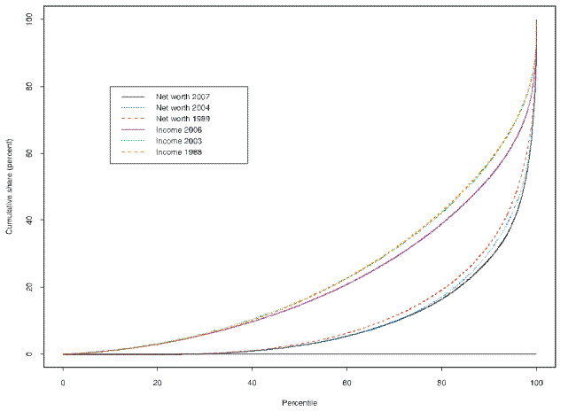 Figure A1: Lorenz curves for 1988, 2003 and 2006 total family income and 1989, 2004 and 2007 net worth.