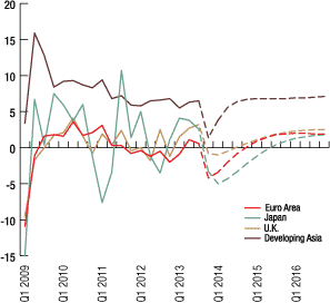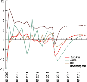 Figures 2 through 6 illustrate the hypothetical trajectories for some of the key variables describing U.S. economic activity and asset prices as well as global economic growth under the severely adverse scenario. As the figures show, real GDP declines nearly 4-3/4 percent between the third quarter of 2013 and the end of 2014; over this period, the four-quarter percent change in the consumer price index (CPI) declines to less than 1 percent before moving back up to 1-1/2 percent from the end of 2015 through 2016. The unemployment rate increases 4 percentage points from the third quarter of 2013, peaking at 11-1/4 percent in the middle of 2015. Equity prices fall nearly 50 percent over the course of the recession, and the equity market volatility index reaches a peak of 68 percent. House prices decline 25 percent during the scenario period, while commercial real estate prices decline nearly 35 percent at their trough. A slow recovery takes hold in 2015, and real GDP expands 2 percent that year and nearly 4 percent in 2016. The international component of the severely adverse scenario features recessions in the euro area, the United Kingdom, and Japan and below-trend growth in developing Asia.
