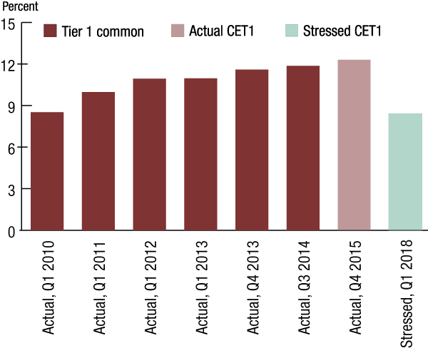 As illustrated in figure 1, in the severely adverse scenario, the aggregate Common Equity Tier 1 (CET1) capital ratio would fall from an actual 12.3 percent in the fourth quarter of 2015 to a post-stress level of 8.4 percent in the first quarter of 2018.