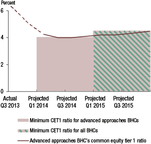 14. See 79 Federal Register 13498 (March 11, 2014). The projected tier 1 common capital ratio is calculated using the definitions of tier 1 capital and total risk-weighted assets in effect before implementation of the revised capital framework (see 12 CFR part 225, appendix A). Return to text