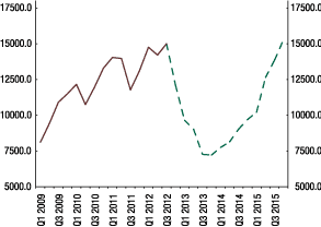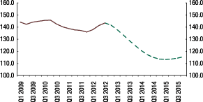 Figures 2 through 6 illustrate the hypothetical trajectories for some of the key variables describing U.S. economic activity and asset prices as well as global economic growth under the severely adverse scenario. As the figures show, real GDP declines nearly 5 percent between the third quarter of 2012 and the end of 2013; over this period, the unemployment rate rises to 12 percent, and the four-quarter percent change in the consumer price index (CPI) decelerates to 1 percent. Equity prices fall more than 50 percent over the course of the recession and, correspondingly, the equity market volatility index jumps from about 21 in the third quarter of 2012 to more than 70 at the start of the scenario. House prices decline more than 20 percent by the end of 2014, and commercial real estate prices fall by a similar amount. The international component of the severely adverse scenario features recessions in the euro area, the United Kingdom, and Japan and below-trend growth in developing Asia.
