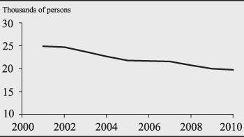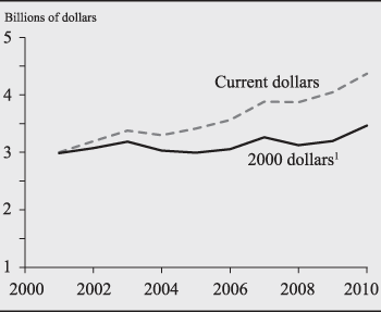 From the actual 2001 level to the budgeted 2010 amount, the total expenses of the Federal Reserve System have increased an average of 4.3 percent per year (1.9 percent per year when adjusted for inflation) (chart 1.2). Over the same period, nondefense discretionary spending by the federal government has increased an average of 8.3 percent per year (chart 1.3). Over the 2001-2010 period, Federal Reserve System employment has decreased by 5,140 (chart 1.4).