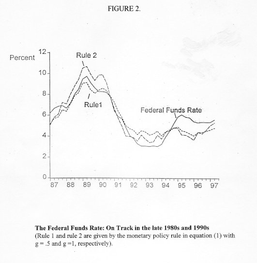 where PFR is the prescribed federal funds rate in nominal terms, the magnitude to be set by the monetary authorities. The equilibrium funds rate in real terms is r* and the actual rate of inflation is p. The deviation of output from its long-term trend is y and desired inflation is p*. While Taylor's rule is often expressed in terms of contemporaneous values of inflation and output, if there are lags in monetary policy, p and y could be forecast values, so that monetary policy could be made forward-looking. Suppose that monetary authorities were close to policy-making bliss, with no actual or forecast output or inflation deviations. Then the authorities would simply set the nominal funds rate at r* + p*, its desired long run value. If there were an inflationary shock, the monetary authorities would raise the funds rate by 1.5 times the change in inflation (the derivative of PFR with respect to p). This means that the real funds rate would rise as inflation rises, preserving the overall system stabilizing properties. If on the other hand, there were a recession, either current or forecast, the implied negative value of y, or output gap, tells authorities to lower the funds rate. The coefficient levels of .5 were inferred by Taylor from the properties of large simulation models of the time, though later research has shown that larger response coefficients would make the rule even more stabilizing (Andrew Levin, Volker Wieland, and John Williams, 1998).6 The adjustment coefficients already build stabilizing properties into the Taylor rule. If inflation rises, the rule tells the Fed to raise the real federal funds rate. If output falls, the rule tells the Fed to lower the real funds rate. But there could be even more stability implicit in this rule than meets the eye, through the behavior of long term bond rates. For any given funds rate, if output rises the spread between long term interest rates and the funds rate will rise and dampen output demand. If output falls, the spread will fall and stimulate output demand. So there are direct stabilizing properties built into the rule, and indirect properties through the behavior of long term bond markets. While such a simple rule might seem woefully inadequate as a descriptor of complex, subtle monetary policy, it turns out to explain actual monetary behavior in recent years quite well. Figure 2, taken from Taylor's 1998 paper, shows the plot of the actual funds rate over the 1987-1997 period. Rule 1 uses the coefficients of .5 and .5; rule 2 doubles the output response coefficient (g in the Figure). By historical standards, the 1987-97 decade was a good decade for the Federal Reserve, with only one recession and with gradually declining inflation rates. The equation tracks the actual path of the federal funds rate over this era of relatively successful policy very well. One could make the fit even closer by fitting equation 1) econometrically -- the fit becomes tighter and the estimated response coefficients rise. While most actual voting members of the open market committee during these years would probably be horrified that their behavior could be captured in such a simple equation, it seems that it can be.