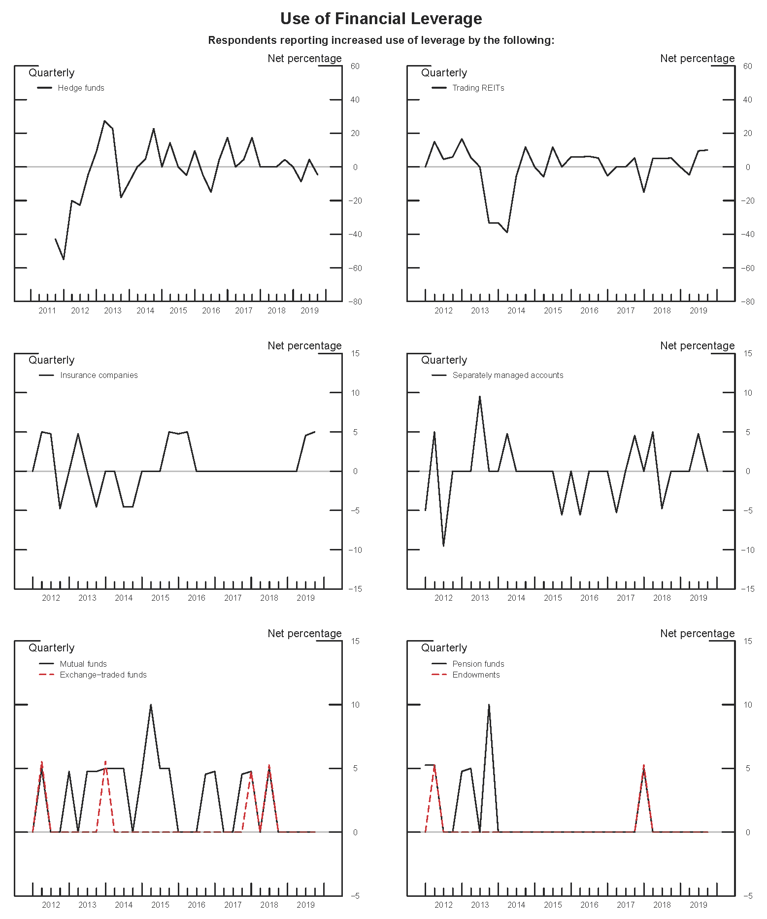 With respect to clients' use of financial leverage, on net, dealers indicated little change over the past three months (see the exhibit Use of Financial Leverage) for all classes of counterparties.