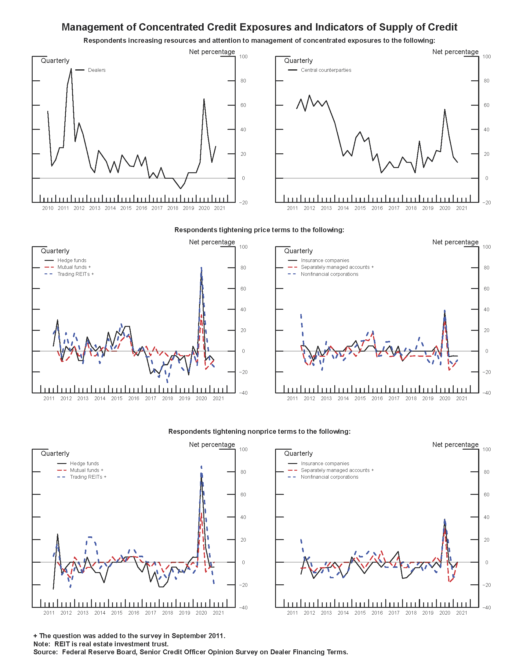 - Small net fractions of dealers reported an easing in price terms on securities financing transactions and OTC derivatives across all counterparty types (see the exhibit Management of Concentrated Credit Exposures and Indicators of Supply of Credit). Nonprice terms generally remained unchanged, although one-fifth reported an easing of nonprice terms for trading real estate investment trusts (REITs). Improvement in general market liquidity and functioning and more-aggressive competition from other institutions were the most cited reasons for this easing of nonprice terms. Nearly one-half of respondents indicated an increase in trading REITs' efforts to negotiate more-favorable price and nonprice terms.
