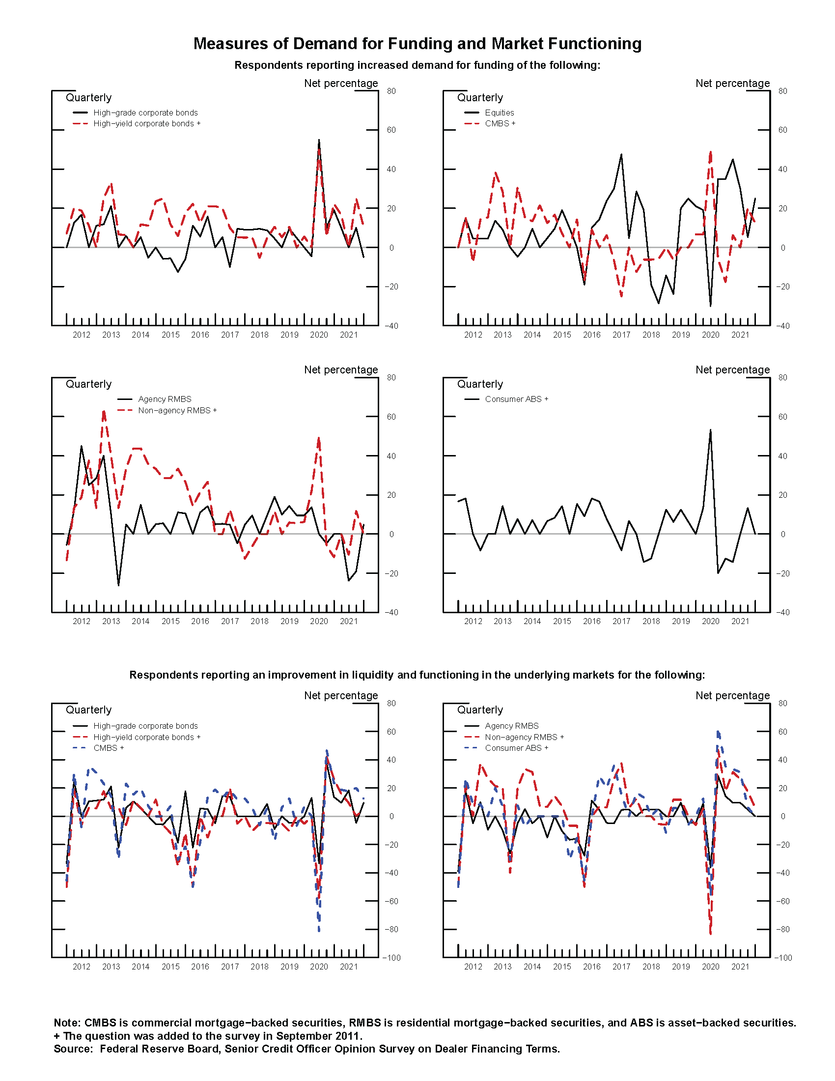 - On net, one-fourth of dealers reported increased demand for funding equities. Demand for funding of other asset classes was largely unchanged (see the exhibit Measures of Demand for Funding and Market Functioning).