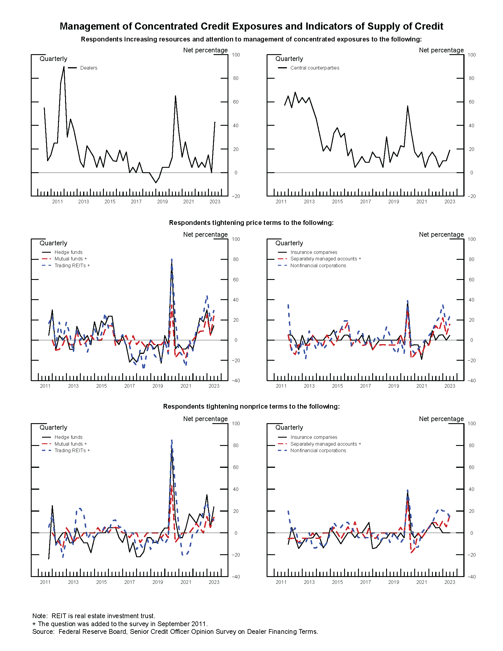 - For trading real estate investment trusts (REITs), around one-third of dealers, on net, reported that price terms on securities financing transactions and OTC derivatives tightened over the past three months. Respondents reported that nonprice terms, such as haircuts, maximum maturity, or covenants remained mostly unchanged. Dealers cited deterioration in current or expected financial strength of counterparties as well as worsening in general market liquidity and functioning as the main reasons for the tightening.