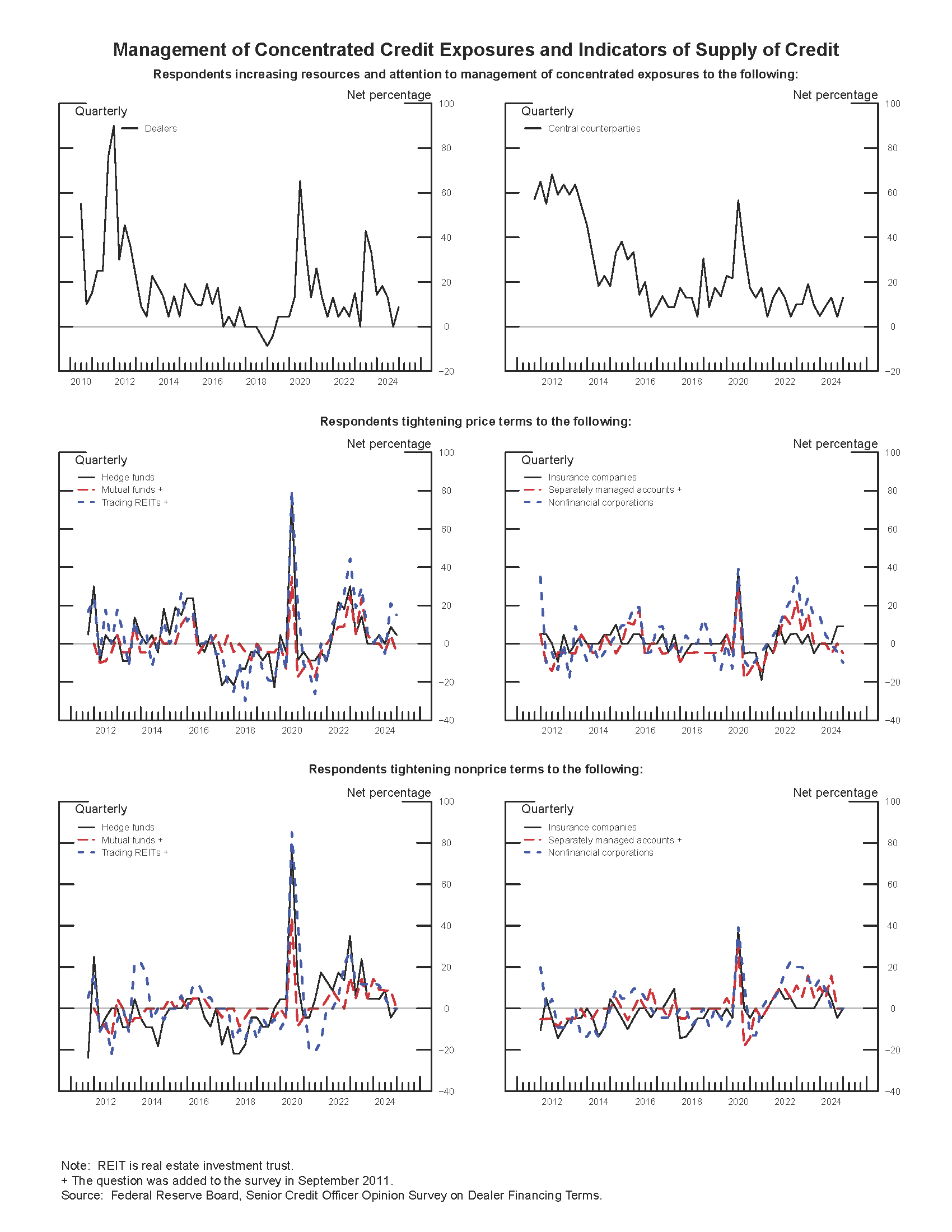 - Price and nonprice terms on securities financing transactions and OTC derivatives were generally unchanged across most types of counterparties. For real estate investment trusts (REITs), a small net fraction of dealers reported tightening of price terms such as financing rates (see the exhibit “Management of Concentrated Credit Exposures and Indicators of Supply of Credit”). One-fourth of dealers indicated an increase in REITs’ efforts to negotiate more-favorable price and nonprice terms, while a small fraction of respondents reported that the intensity of efforts by hedge funds to negotiate more-favorable terms increased somewhat over the period.