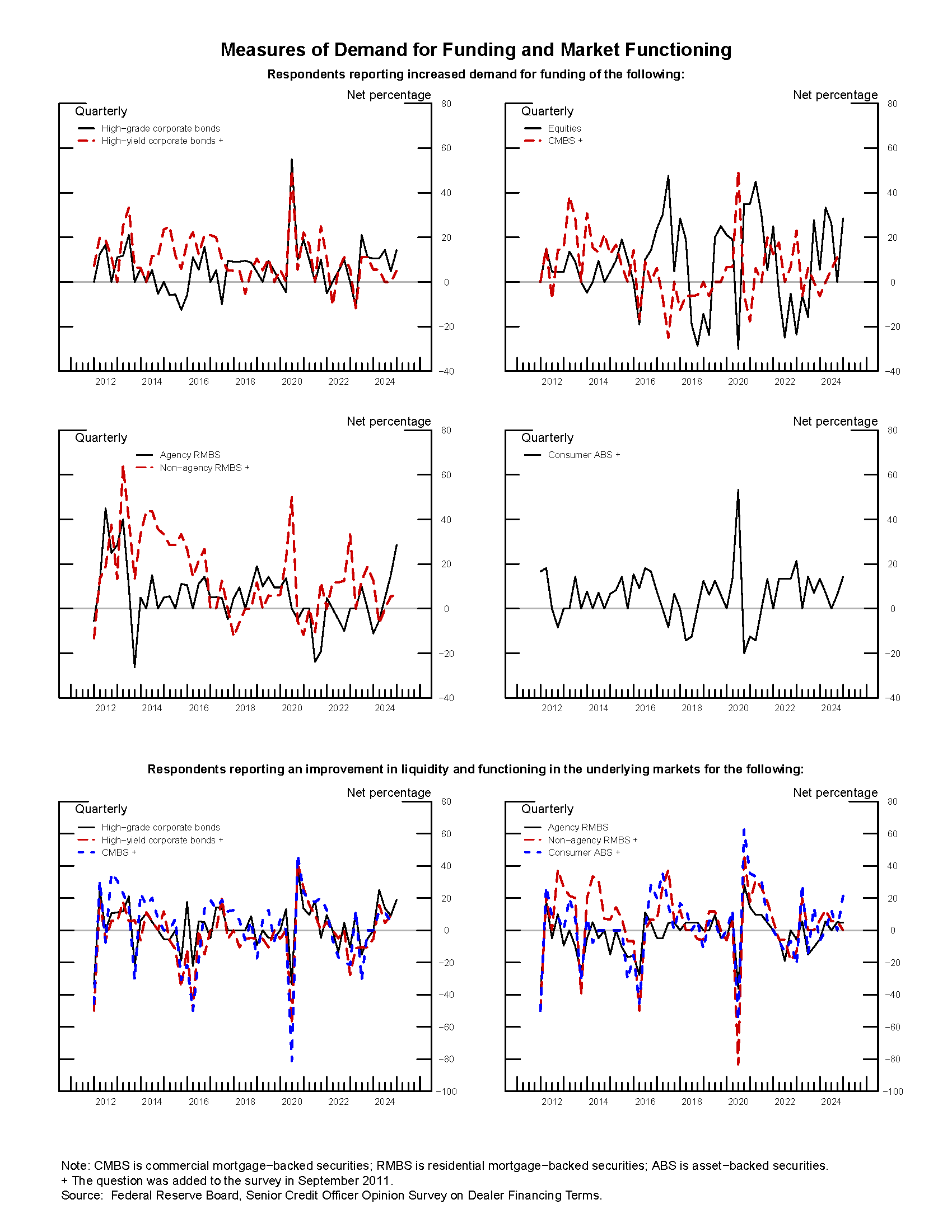 - On net, about one-third of dealers reported increased demand for funding equities and agency RMBS, while a small fraction of respondents indicated an increase in demand for funding of high-grade corporate bonds. Demand for funding of all other asset classes was largely unchanged (see the exhibit “Measures of Demand for Funding and Market Functioning”).