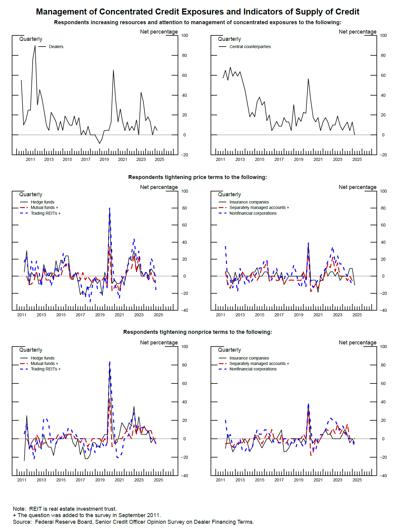 - Price and nonprice terms on securities financing transactions and OTC derivatives were generally unchanged, on net, across most classes of counterparties. For trading real estate investment trusts (REITs), a small fraction of dealers reported easing of price terms (such as financing rates) over the past three months (see the exhibit "Management of Concentrated Credit Exposures and Indicators of Supply of Credit"). Dealers cited more-aggressive competition from other institutions as the main reason for easing. Around one-fourth of dealers reported that the intensity of efforts by hedge funds and REITs to negotiate more-favorable price and nonprice terms increased somewhat, as did a small fraction of dealers for insurance companies.