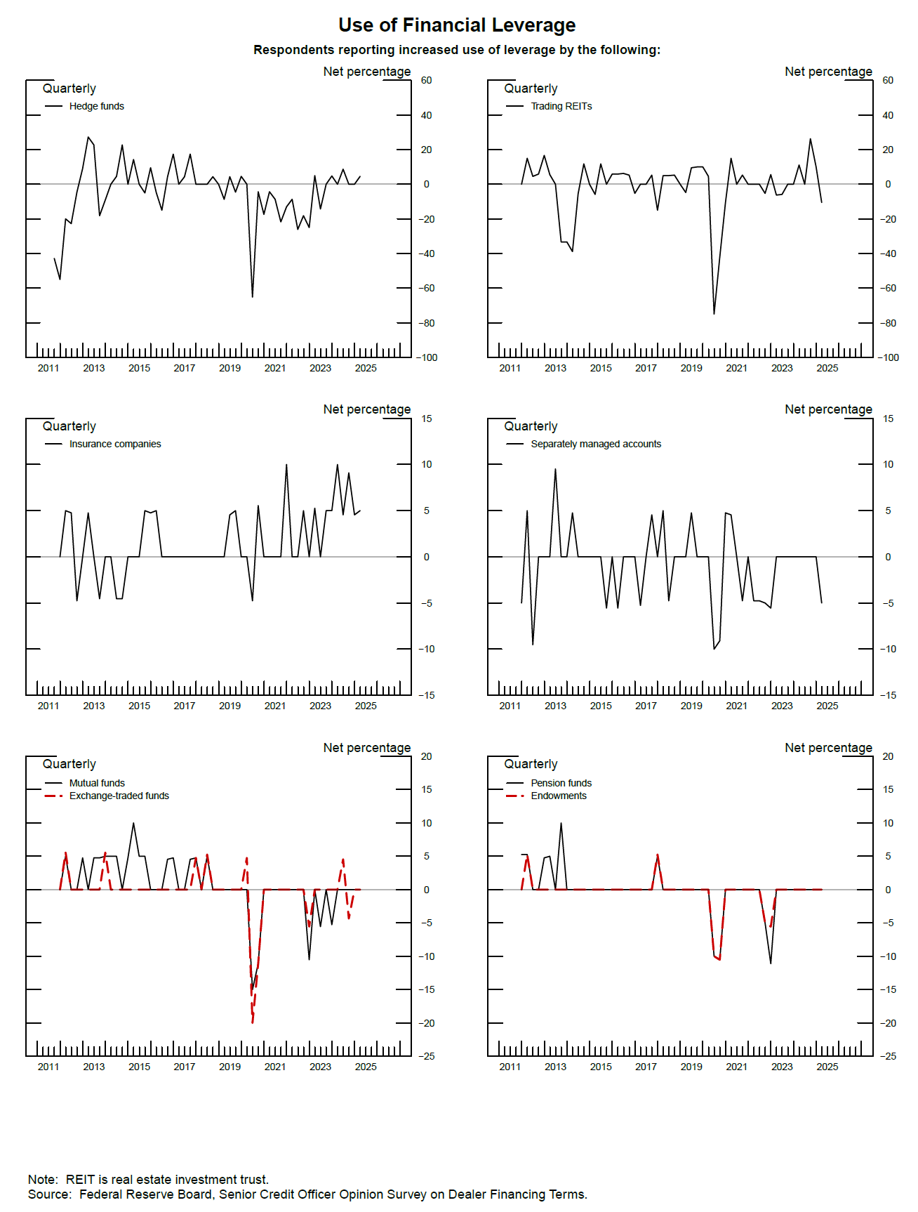 With respect to clients' use of financial leverage, dealers reported that the use of leverage remained basically unchanged, on net, for all client types (see the exhibit "Use of Financial Leverage").