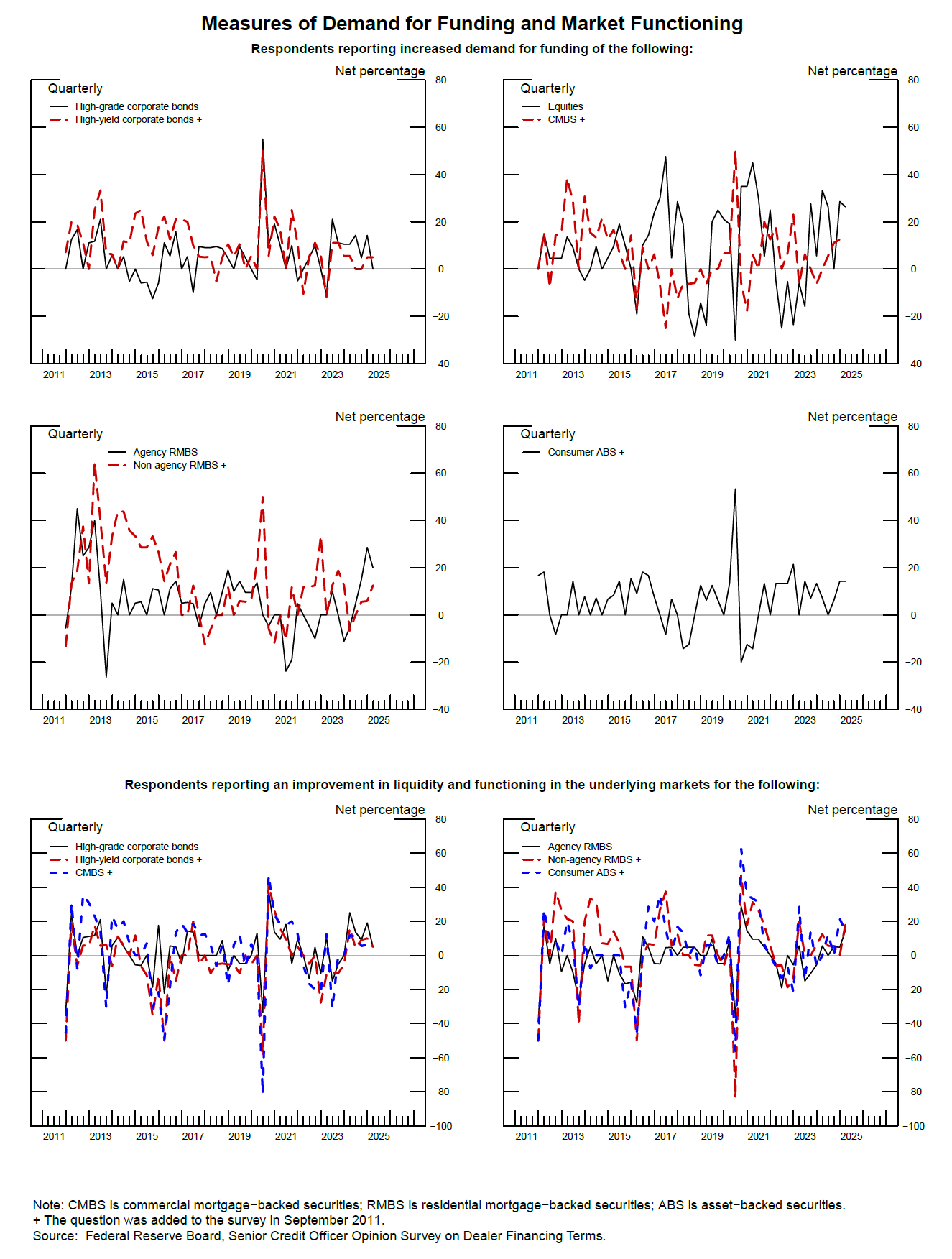 - On net, about one-fourth of dealers reported increased demand for funding of equities (including through stock loans), as did one-fifth of dealers for funding of agency RMBS. Demand for funding of all other asset classes was largely unchanged (see the exhibit "Measures of Demand for Funding and Market Functioning").