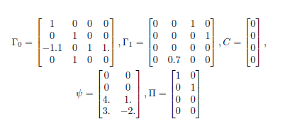 >> [ggg,ccc,iii,fff,ffw,yyw,gev,eue]=gensysToAMA(g0,g1,cc,psi,pi,1.0,both);