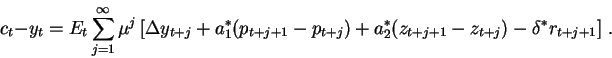 ![c sub(t) minus y sub(t) equals E sub(t) times the summation from j equals 1 to infinity of the quantity mu to the j times [ delta y sub(t+j) plus a_star sub(1) times the quantity p sub(t+j+1) minus p sub(t+j) plus a_star sub(2) times the quantity z sub(t+j+1) minus z sub(t+j) minus delta times r sub(t+j+1) ]](https://www.federalreserve.gov/econresdata/ama/images/img5.gif)