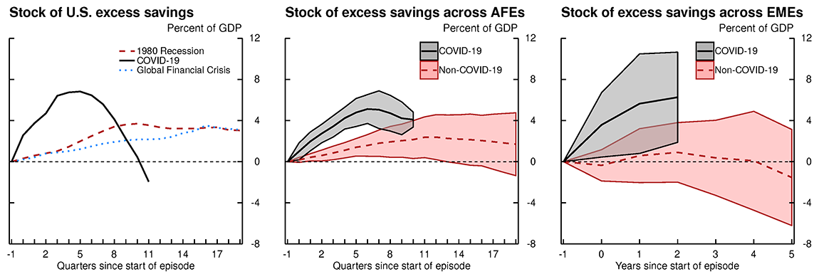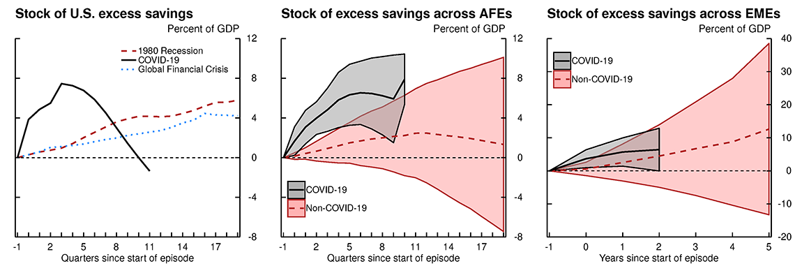 Relative to COVID-19, the non-COVID-19 episodes feature a more gradual evolution in the stock of excess savings for the AFEs, as it does in the United States. The average stock of excess savings during non-COVID-19 AFE episodes reaches its peak about three years after the start of the recession. Based on the shaded areas, however, there is a meaningful amount of heterogeneity across countries.