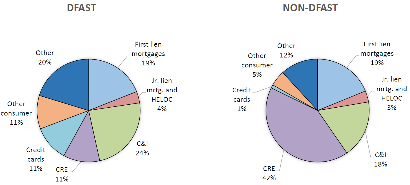 2. For the summary statistics in the first part of this note, the DFAST group is defined using the BHCs subject to the 2018 test. The non-DFAST group is defined as all other banking institutions. The 2018 DFAST BHCs are: Ally Financial, American Express, Bank of America, Bank of New York Mellon, Barclays, BB&T, BBVA Compass, BMO Financial, BNP Paribas USA (formerly BancWest), Capital One, Citigroup, Citizens Financial, Deutsche Bank, Discover, Fifth Third, Goldman Sachs, HSBC, Huntington, JPMorgan, KeyCorp, M&T Bank, Morgan Stanley, MUFG, Northern Trust, PNC Financial, RBC USA, Regions Financial, Santander, State Street, SunTrust, TD Group, U.S. Bancorp, and Wells Fargo. All BHCs above $3 billion in consolidated assets are captured through a mandatory filing, the FR Y-9C form. All other BHCs and standalone banks are captured using Call Report (FFIEC 031 and 041) data. Return to text