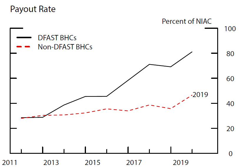 Note: The DFAST group is defined as the 33 BHCs from the 2018 exercise. Payout rate is defined as treasury stock purchases plus dividends on common shares plus retirements of common stock, and is shown as a percent of net income available to common shareholders (NIAC).