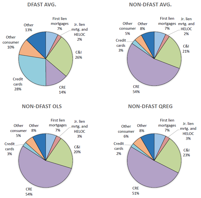 This figure shows the composition of loan losses for DFAST BHCs and loan losses for non-DFAST BHCs using the three estimation methods described above. OLS is the loan composition method, and QREG is the quantile regression at the 75th percentile using the loan composition detail.