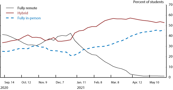 11. This may be different from the fraction of students engaged in each type of education at any point, since some districts offer students a choice (e.g. either in-person or remote, or in-person, or hybrid) Return to text