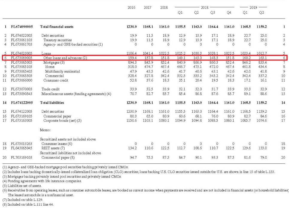 Leveraged loans held by domestic CLO issuers are shown on line 6 of table L.127. Federal Reserve Board staff use the lender and loan information in the Shared National Credit database to estimate the amount of loans held by domestic CLO issuers.4 As of 2019:Q2, domestic CLO issuers are estimated to hold about $163 billion of leveraged loans. An interactive guide to the Financial Accounts data on the Board's website provides more information on the sources and methodology used for these estimates and the others described in this note.