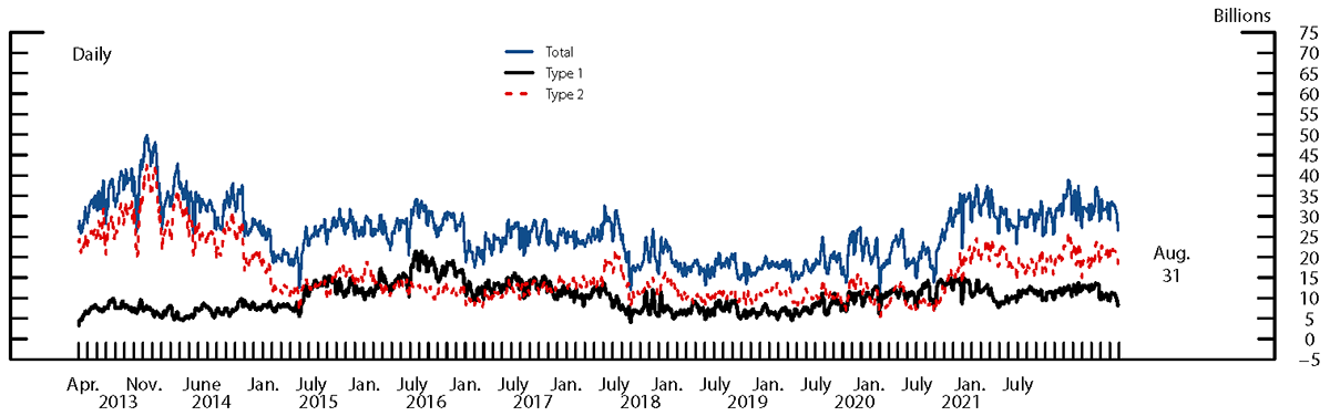 Dealer-intermediated trades account for the majority of the CP primary-market transactions, as illustrated in the charts below. Direct issuance (type 1) has made up a relatively small share of the CP market since 2013. Over the period from April 2013 to August 2022, the market share of direct issuance averaged about 20 percent and ranged from about 10 to 40 percent (Figures 1 and 2).