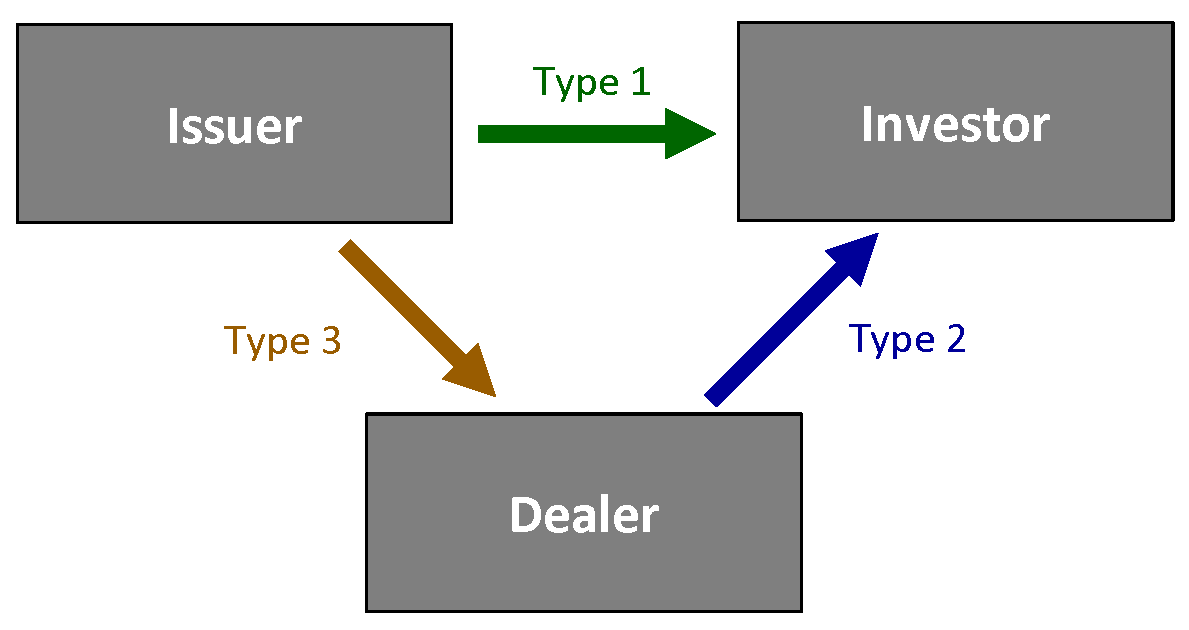 In this project, we focus on primary-market trading of CP, which accounts for over 90 percent of total CP trading. The primary market for CP has two distribution channels: Directly placed, where issuers sell directly to investors, and dealer intermediated, where an issuer sells to a dealer and the dealer sells to investors. As such, we identify three types of transactions: direct placement from an issuer to an investor (type 1), dealer purchase from the issuer (type 3), and dealer sale to an investor (type 2). These types are illustrated in the diagram below.