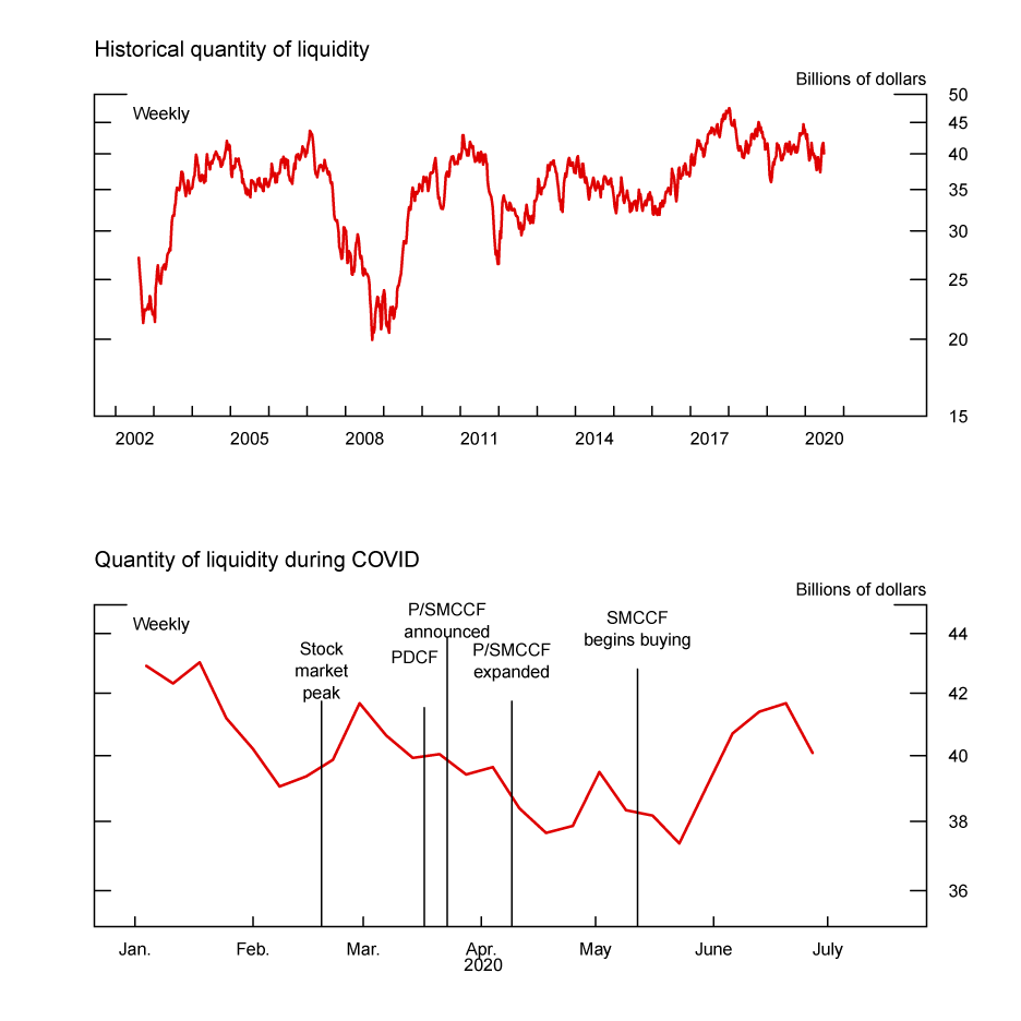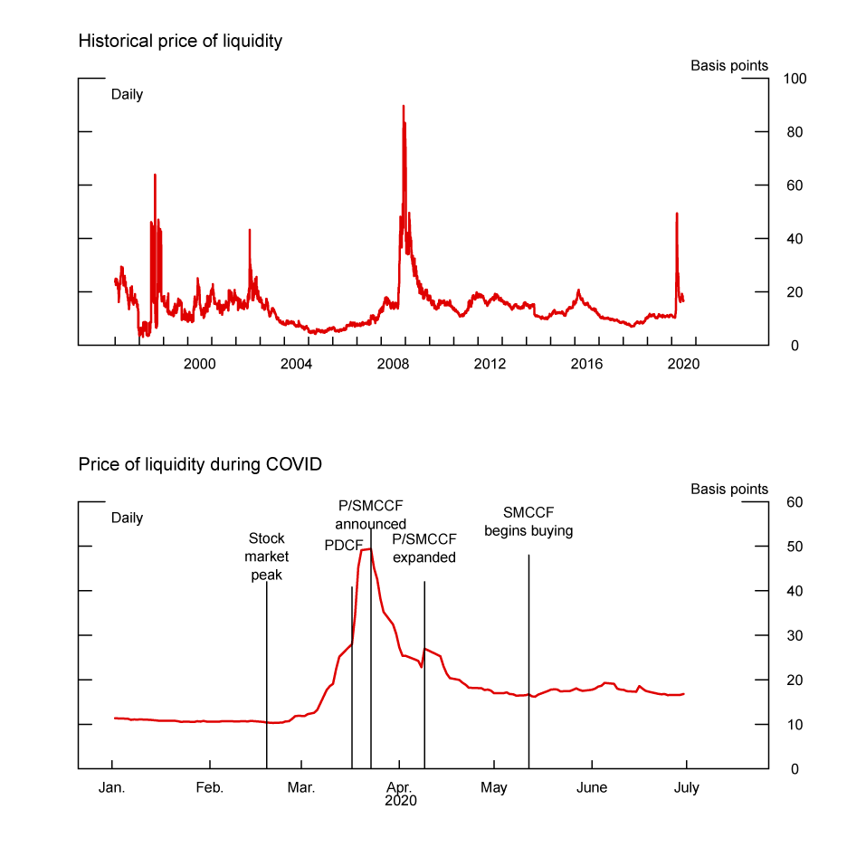 - The price of liquidity declined notably after the March 23 announcement of the Primary Market Corporate Credit Facility (PMCCF) and the Secondary Market Corporate Credit Facility (SMCCF) and the April 9 announcement expanding the size and scope of the corporate credit facilities (CCFs).