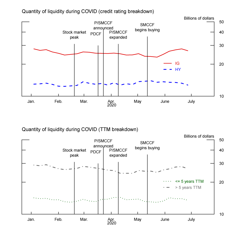 Note: The quantity of liquidity shown is dealer gross positions, or the sum gross long and gross short positions in corporate bonds. The top panel shows noise for investment-grade (IG) and high-yield (HY) bonds. The bottom panel shows noise for bonds in two remaining-maturity categories: less than or equal to 5 years remaining maturity, and greater than 5 years remaining maturity. Vertical lines mark the "Stock market peak" on Feb. 19. The "PDCF" corresponds to the announcement of the Primary Dealer Credit Facility on March 17. The PDCF began operations on March 20. The "P/SMCCF announced" vertical line is marked at March 23, the "P/SMCCF expanded" vertical line is marked at April 9, and the "SMCCF begins buying" vertical line is marked at May 12.