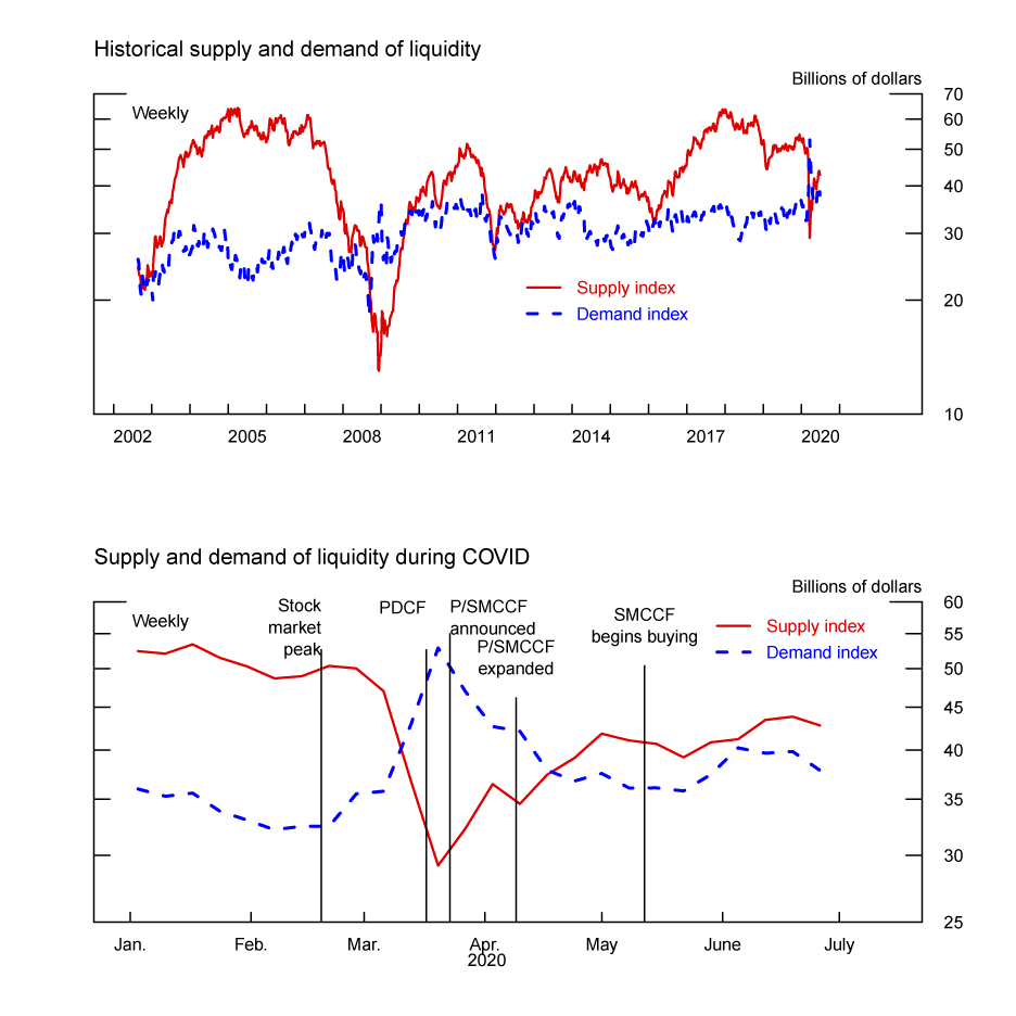 - We parse the evolution of liquidity supply and demand using Goldberg and Nozawa's (2021) model. The model attributes the liquidity dry-up during the COVID crisis about equally to lower liquidity supply and higher liquidity demand. Our liquidity supply index reached a trough on March 20, after the Primary Dealer Credit Facility (PDCF) announcement.
