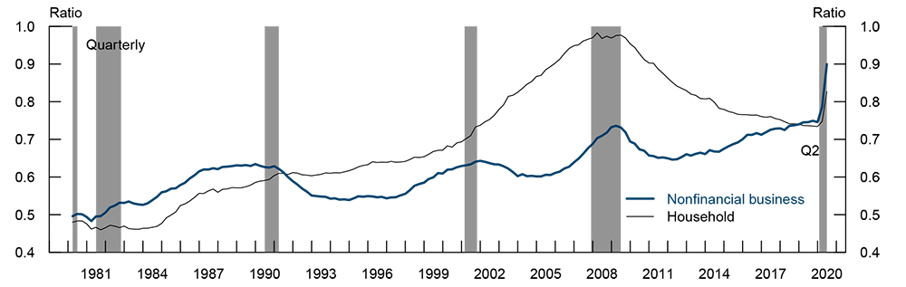 We conclude by evaluating how the COVID-19 crisis might affect leverage in the business and household sectors going forward. An indicator of the leverage of businesses—the ratio of debt to assets for all publicly traded nonfinancial firms—was at its highest level in 20 years at the end of the second quarter of 2020. Moreover, for highly leveraged public firms—defined as firms above the 75th percentile of the leverage distribution—this indicator is close to a record high. As the economic effects of COVID-19 continue to unfold, earnings declines could trigger a sizable increase in firm defaults. Policy interventions may help businesses withstand a period of weak earnings by issuing new debt and restructuring existing credit. As a result, many of these businesses will emerge with even higher amounts of leverage, suggesting that vulnerabilities stemming from the business sector, including nonpublic companies and small businesses, could become even more elevated for some time. On the other hand, households debt has grown modestly, and only among borrowers with prime credit scores. Taken together, in the wake of the COVID-19 crisis, business leverage has increased further relative to HD. Therefore, the BD fire-sale risks that we identify in our analysis present a greater concern in the post-COVID-19 period.