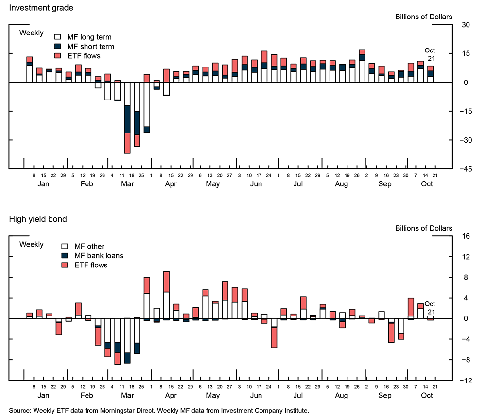 The Federal Reserve has undertaken several extraordinary policy actions, to support the flow of credit to businesses and households, many of which have helped improve market conditions and restore investor confidence15. Of these, the Secondary Market Corporate Credit Facility (SMCCF) is most relevant for the BD markets16. Since its announcement on March 23, 2020, this facility appears to have had a calming effect across corporate bond markets. Even though it was initially targeted at the IG portion of the market, outflows from both IG and HY bond funds have mostly reversed since then, which likely have mitigated some of the imminent fire-sale risks (Figure 3).