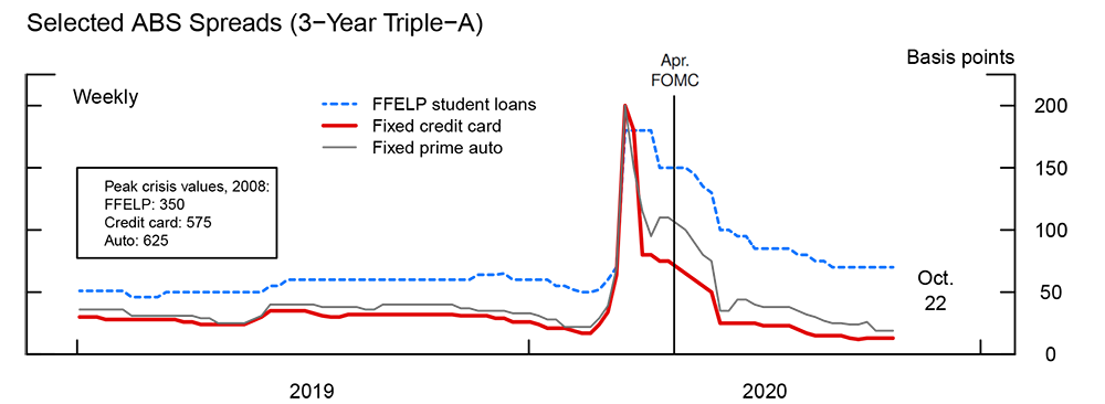 Starting in late February 2020, prior to the announcements of the initial Federal Reserve actions, conditions deteriorated sharply in other securitized markets, such as those for asset-backed securities (ABS) and commercial mortgage-backed securities (CMBS); primary market issuance slowed, secondary market trading became impaired, and spreads widened sharply (Figure 6). To alleviate the strains in these markets, the FOMC decided to include agency CMBS in its MBS purchase program and re-established the Term Asset-Backed Securities Loan Facility (TALF), which will enable the issuance of asset-backed securities (ABS) backed by student loans, auto loans, credit card loans; loans guaranteed by the Small Business Administration (SBA); and certain other assets. Shortly after these measures were announced, strains in the consumer ABS markets began to ease.