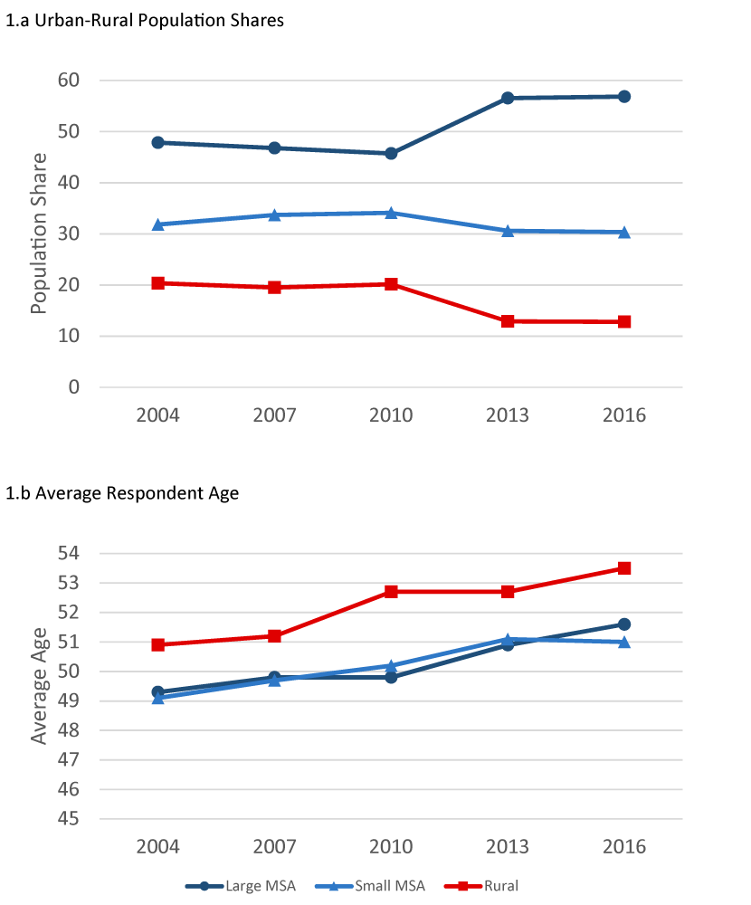 We begin with trends in household demographics, plotted in Figure 1. The proportion of SCF households living in large MSAs increased from 2004 to 2016 (+9%) and decreased in both rural areas (-7.6%) and small MSAs (-1.5%). Notice that during this time the MSAs themselves also grew. Age across the rural-urban household groups trended upward in parallel, and households in rural areas remained slightly older compared to households in MSAs across survey waves. While the prevalence of non-white SCF households increases over time, there is no differential change in racial compositions between rural areas and MSAs.
