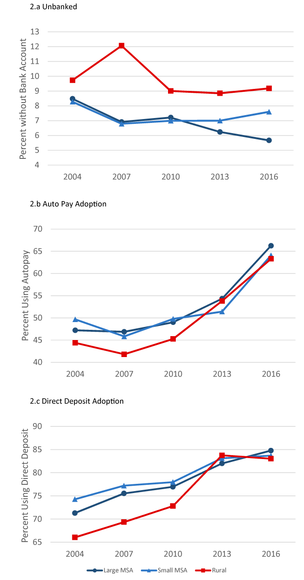 In the 2016 SCF wave, there were no substantial differences between rural areas and MSAs in use of branches, autopay, or direct deposit. We cannot examine trends in branch use, because branch use was not surveyed in SCF waves prior to 2016. However, trends in autopay and direct deposit use are observable in Figure 2b and Figure 2c, respectively.