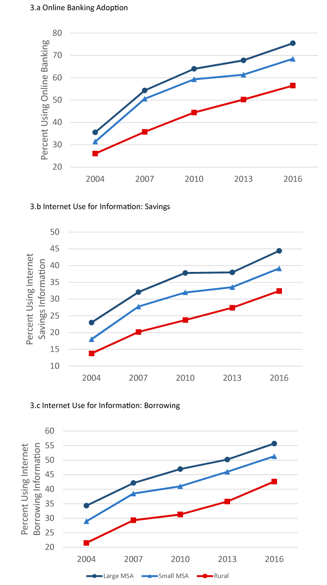Adoption of online banking was slightly more accelerated in MSAs than in rural areas. The fraction using online banking services more than doubled from 2004-2016: from 26.1% to 56.5% in rural areas, from 31.4% to 68.5% in small MSAs, and from 35.6% to 75.5% in large MSAs. The proportion of households using the internet to obtain information for banking decisions also grew dramatically. The fraction using the internet for borrowing information increased over 2004-2016 from 21.5% to 42.6% in rural areas, from 28.9% to 51.3% in small MSAs, and from 34.3% to 75.5% in large MSAs. Internet use for savings information remains less frequent than internet use for borrowing information through all SCF waves, but trended similarly over 2004-2016. The fraction using the internet to obtain savings information increased from 13.8% to 32.4% in rural areas, from 18% to 39% in small MSAs, and from 23% to 44.4% in large MSAs.